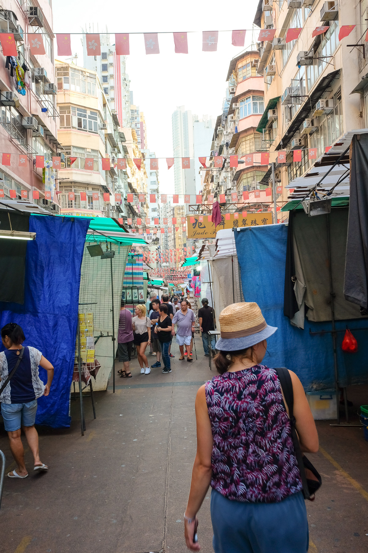 Die Insel Kowloon ist im Gegensatz zur Hongkong Island stärker asiatisch geprägt. Mit seiner hohen Einwohnerdichte ist der Trubel hier noch intensiver, als auf der anderen Seite des Wassers. Zwischen den vielen asiatischen Restaurants und Marktständen drängen sich die Menschen und man wird teilweise einfach weitergeschoben. Gepaart mit der glühenden Hitze machte uns unser erster Ausflug nach Kowloon ein bisschen Probleme mit unserem Kreislauf. Daher versuchten wir uns zunächst im Kowloon Park und dann in einem Starbucks abzukühlen. Als das alles nicht so wirklich half, traten wir recht bald den Rückzug an.