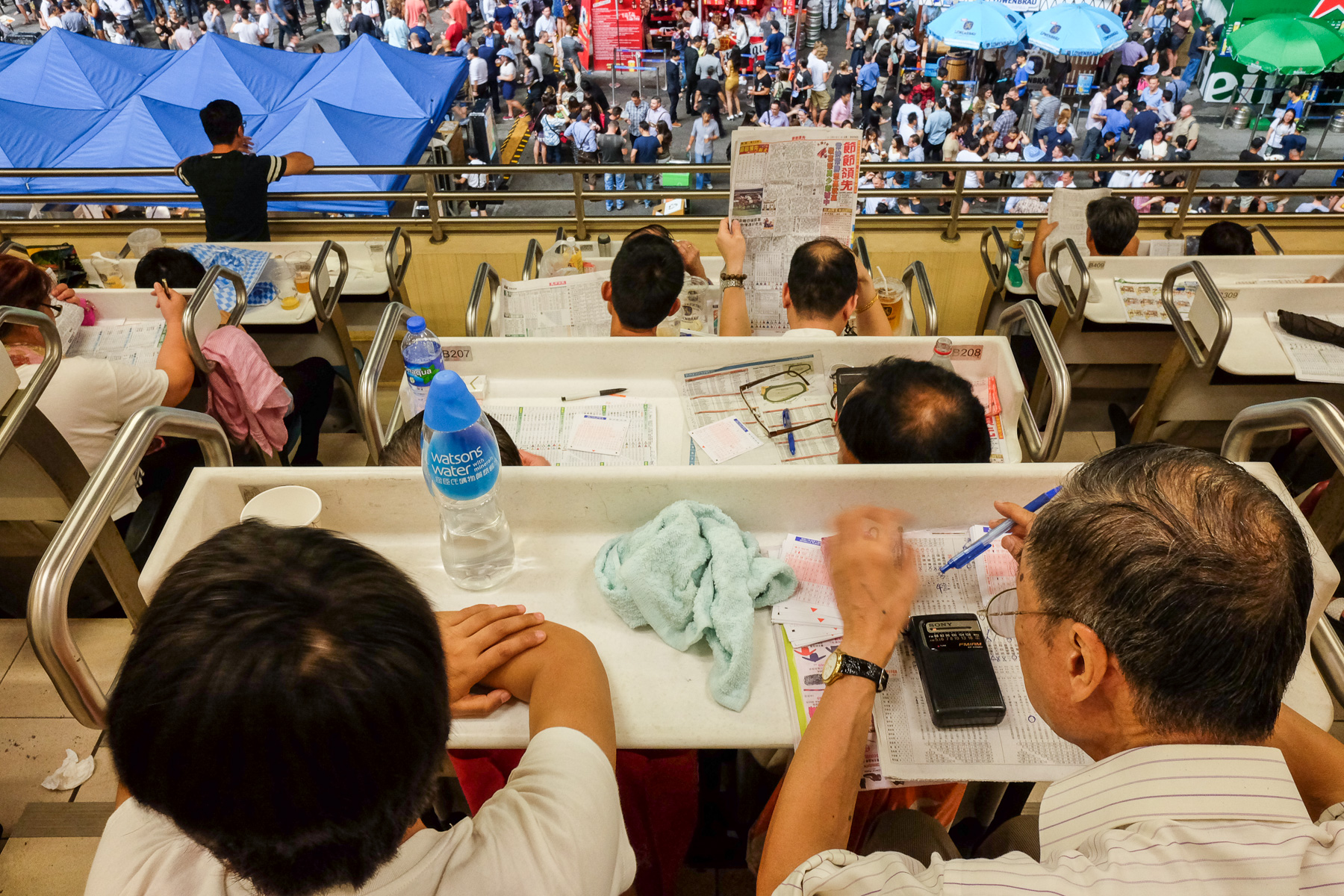 Die Rennbahn kann man ganz bequem mit der Tram erreichen und man darf sogar seine eigenen Getränke mitbringen (was wir natürlich getan haben). Im unteren Bereich befanden sich einige Essens- und Getränkestände um die sich viele Menschen drängten. Weiter oben saßen die Wettprofis. Man erkannte sie an dem großen Stapel Wettscheine vor sich und den ernsten, konzentrierten Mienen. Erst als die Pferde an den Start kamen, erwachten sie zum Leben und feuerten ihren Gaul an, was das Zeug hielt.