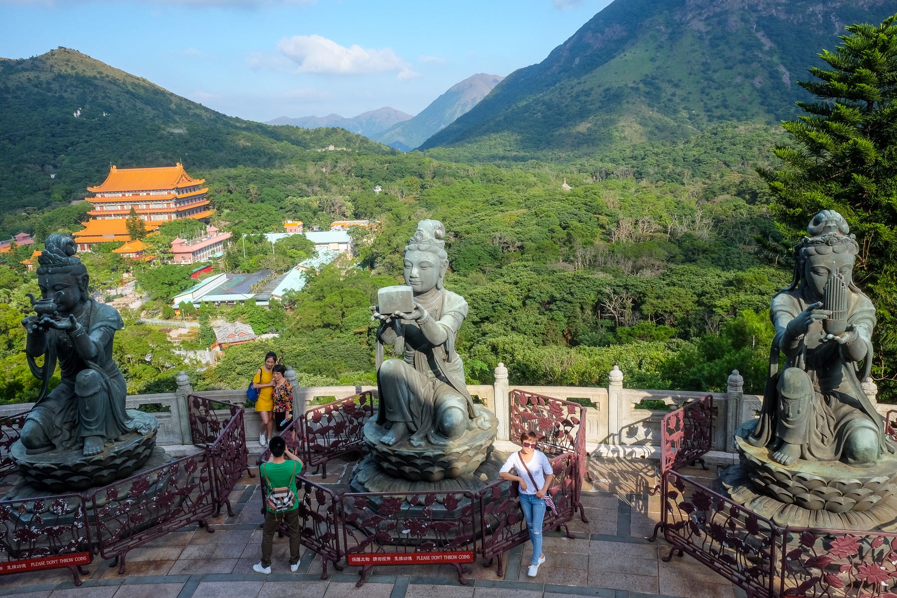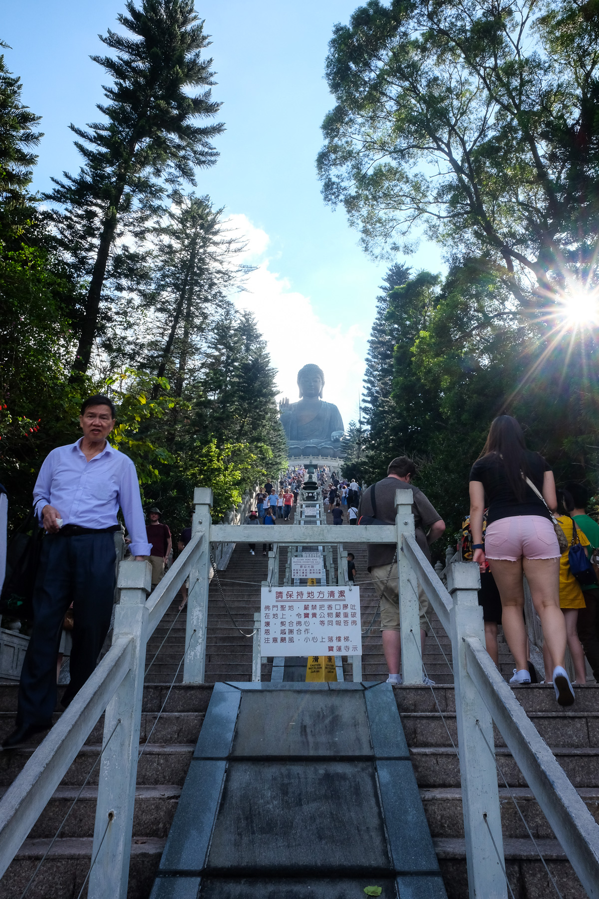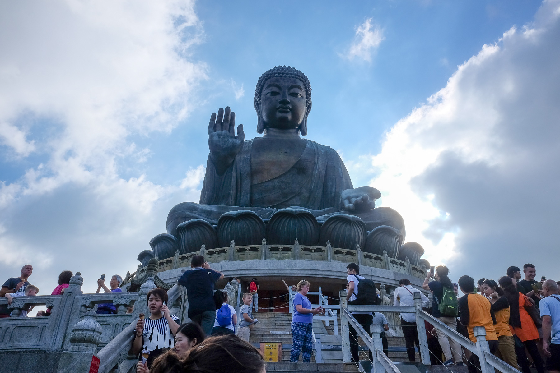 Als wir nach ca. 2 Stunden endlich beim großen Buddha ankamen, waren wir ziemlich fertig und gleichzeitig überglücklich. Der Big Buddha (Tian Tan Buddha) mit einer Höhe von 34 Metern ist das größte buddhistische Monument in Hongkong. Man muss 268 Stufen hochgehen (als ob wir zuvor nicht schon genug Stufen nehmen mussten) um zur Statue zu gelangen, die auf einem Lotusthron sitzt. 8 weitere Bronzestatuen umgeben Buddha. Sie stellen normale Menschen dar, die Opfergaben hochhalten.