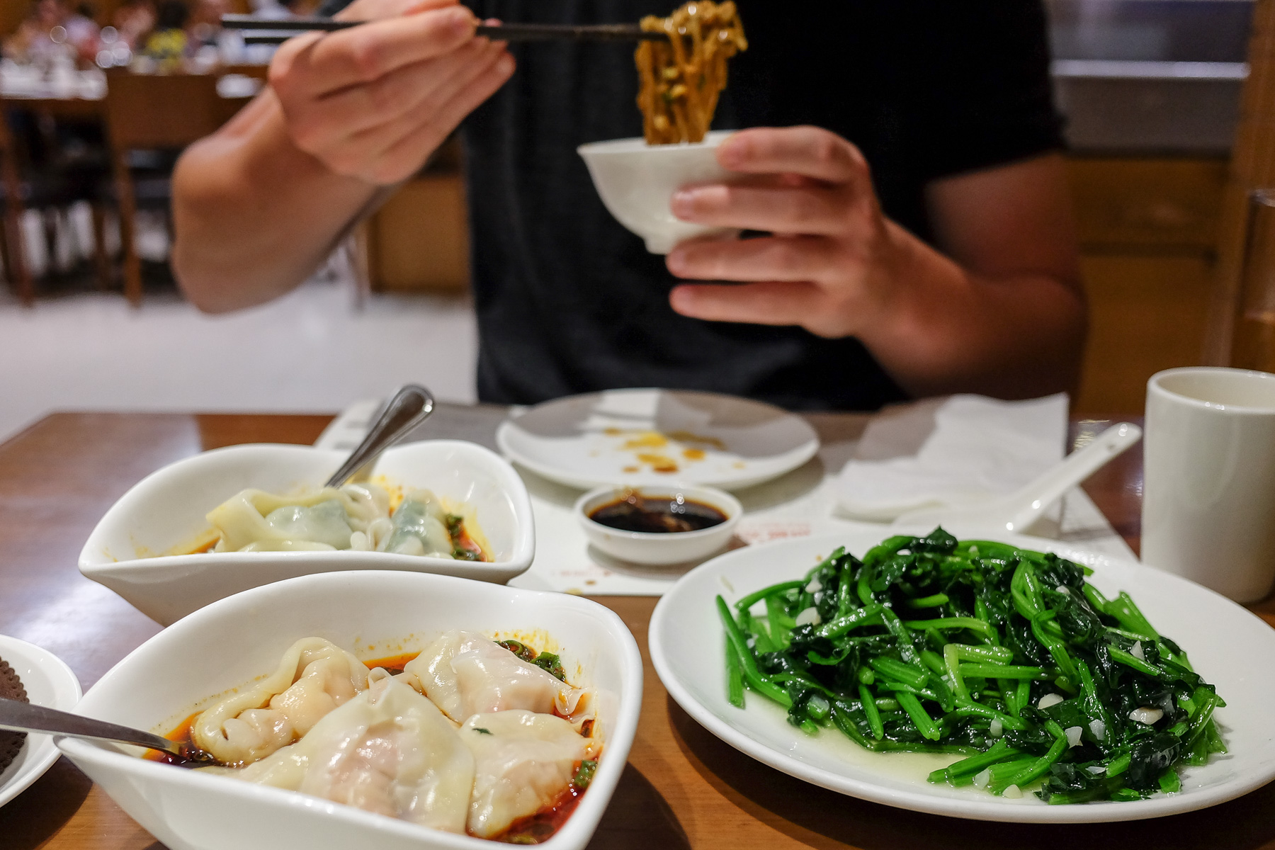 Das taiwanesische Restaurant mit Filialen in vielen Teilen der Welt (Japan, Australien, Dubai, etc.) ist für seine köstlichen Dim Sum bekannt. Die Filiale in Hongkong ist sogar mit einem Michelin Star ausgezeichnet worden. Und das unserer Meinung nach zurecht. Nicht nur die gedämpften Knödel waren mega lecker, sondern auch die Wontons in Sauce, die Nudeln, die scharfen Gurken, der Wasserspinat und und und. Es war so lecker, dass wir gleich zweimal hier unser Geld ließen.