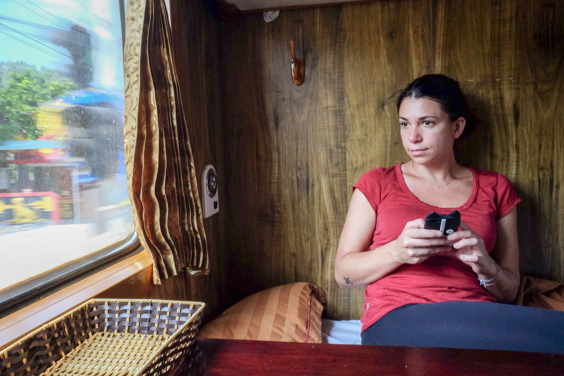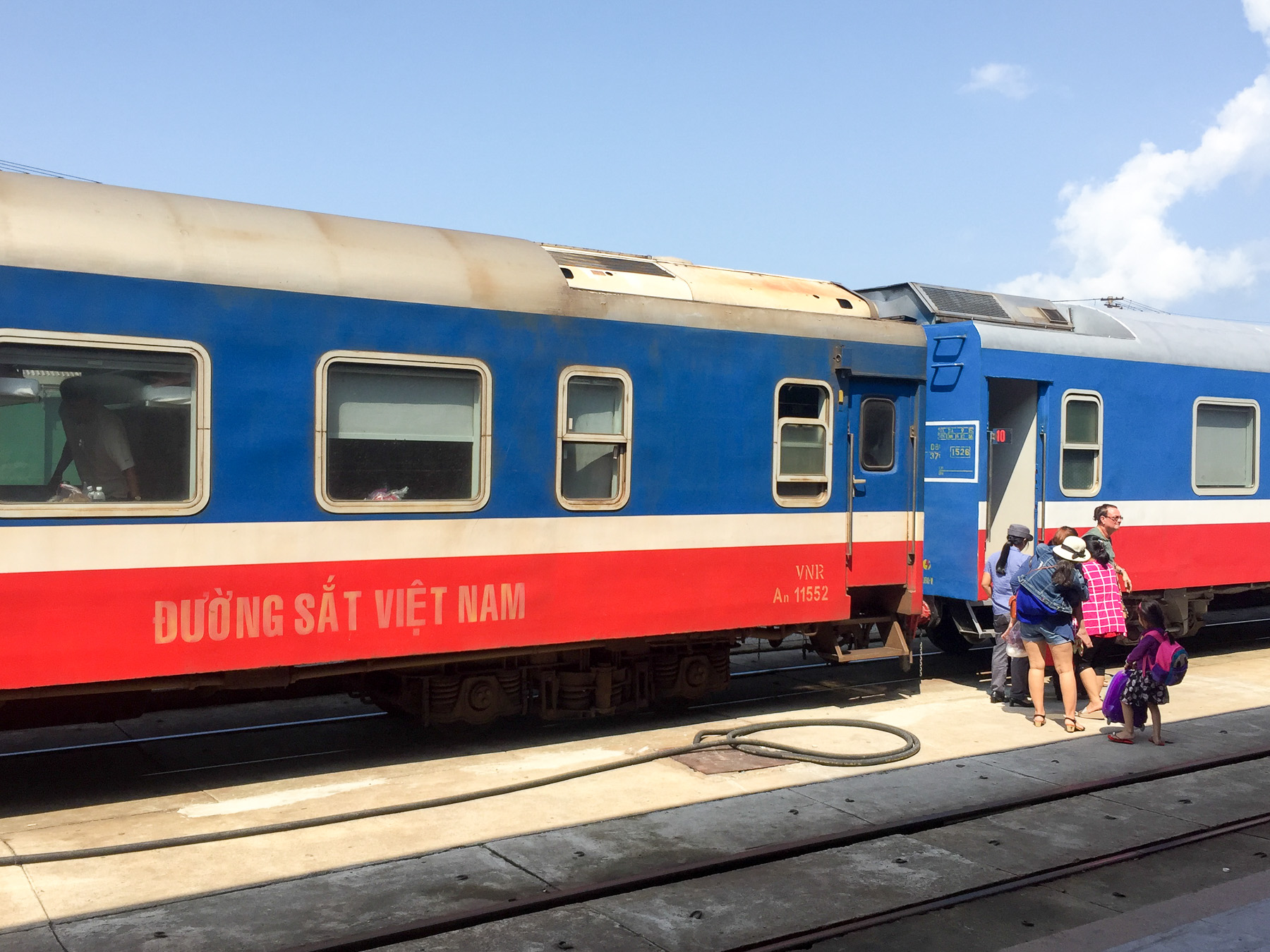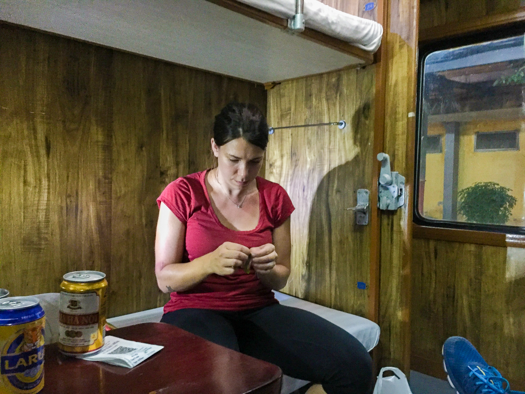 Die oberen Betten unseres 4er-Abteils wurden von zwei jungen Amerikanern besetzt, die wir nur beim Ein- und Aussteigen zu Gesicht bekamen. Nicht mal auf Toilette mussten die beiden in den vielen Stunden Zugfahrt. Bevor es losging, besorgten wir uns noch Proviant: Banh Mi Sandwiches, Frühstück, Süßigkeiten, Wasser und eine extra große Packung Taschentücher. Wozu die? Meine Pechsträhne nahm kein Ende und ich bekam an diesem Tag eine böse Erkältung. Die ganze Nacht schniefte ich vor mich hin, was mir irgendwann ein bisschen unangenehm wurde. Trotz allem war die Fahrt erstaunlich angenehm. Marc konnte sich im Bett sogar komplett ausstrecken und so ganz gut schlafen.