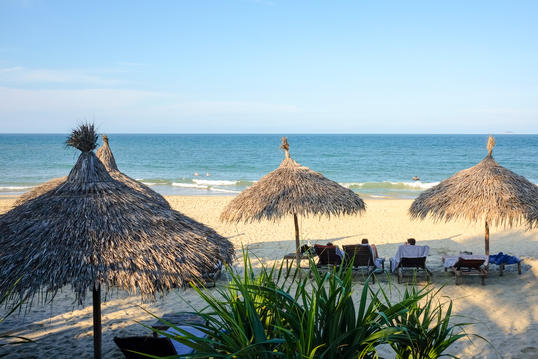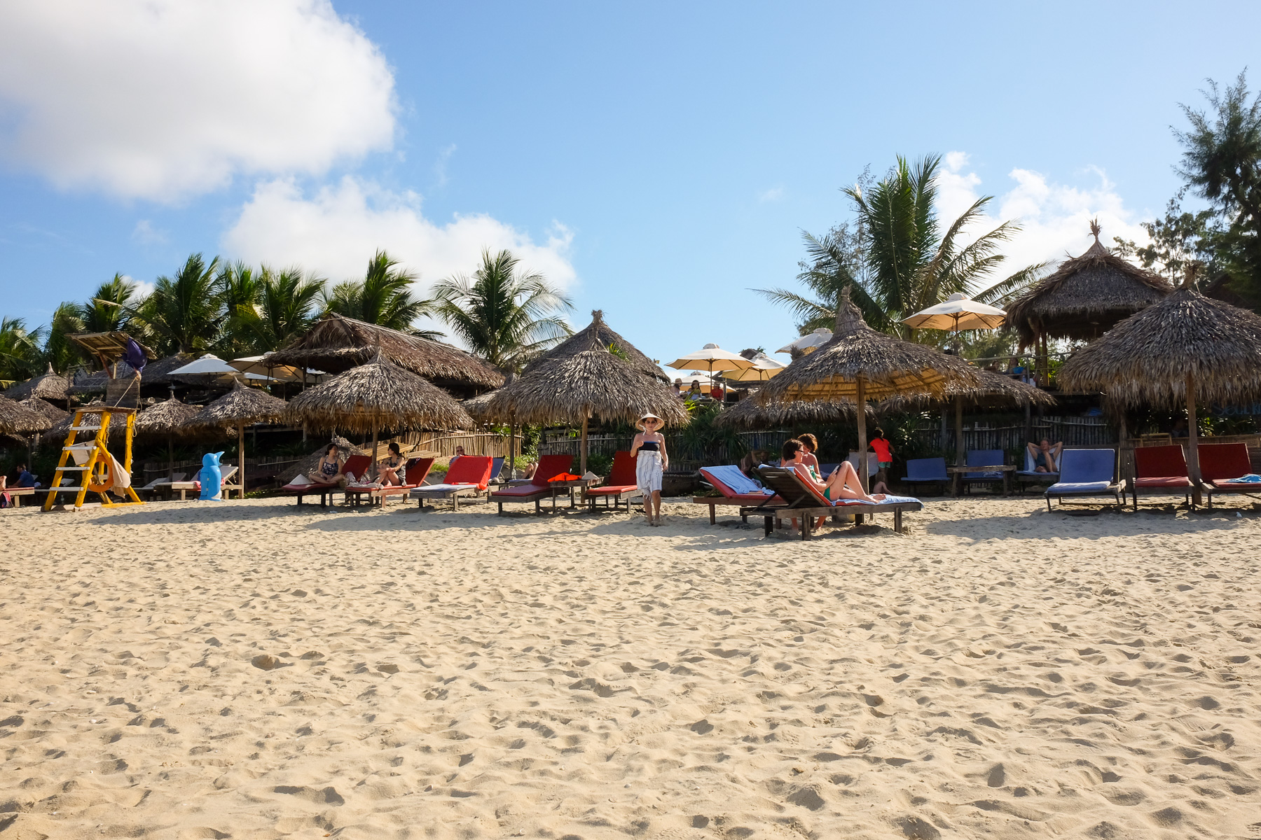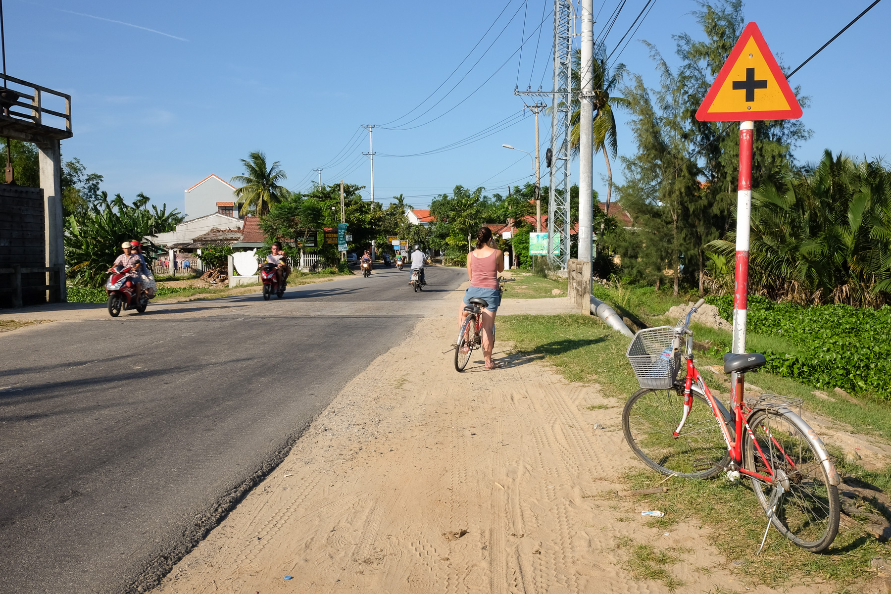 Hoi An ist bei den meisten Leuten für zwei Dinge bekannt: Schneidereien, in denen man sich maßgeschneiderte Kleidung für wenig Geld anfertigen lassen kann und eine große Auswahl an Kochkursen. Zu unserer Freude kam noch ein weiterer positiver Aspekt dazu: ein sehr hübscher Strand. Nach einer kurzen Stärkung bei Madam Khan mit einem leckeren Banh Mi, radelten wir mit unseren Leihrädern die paar Kilometer zum Meer.