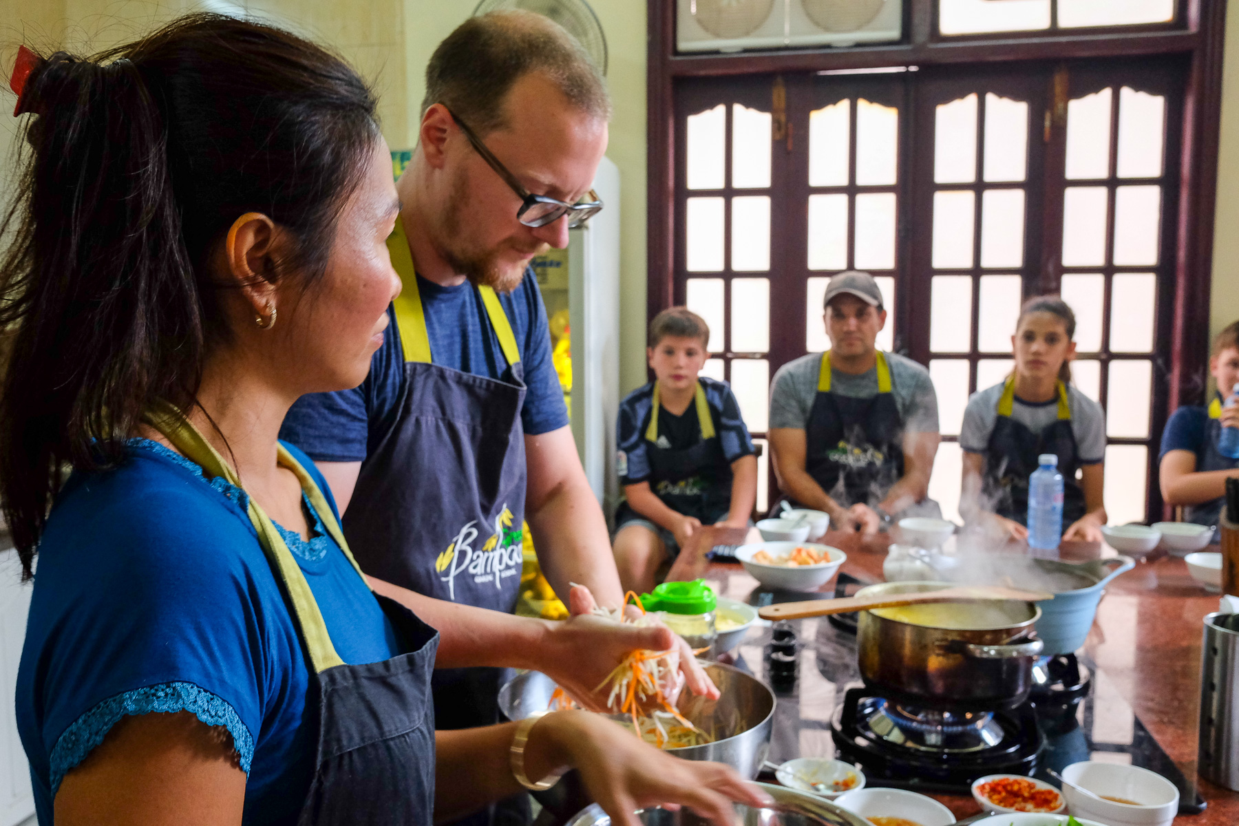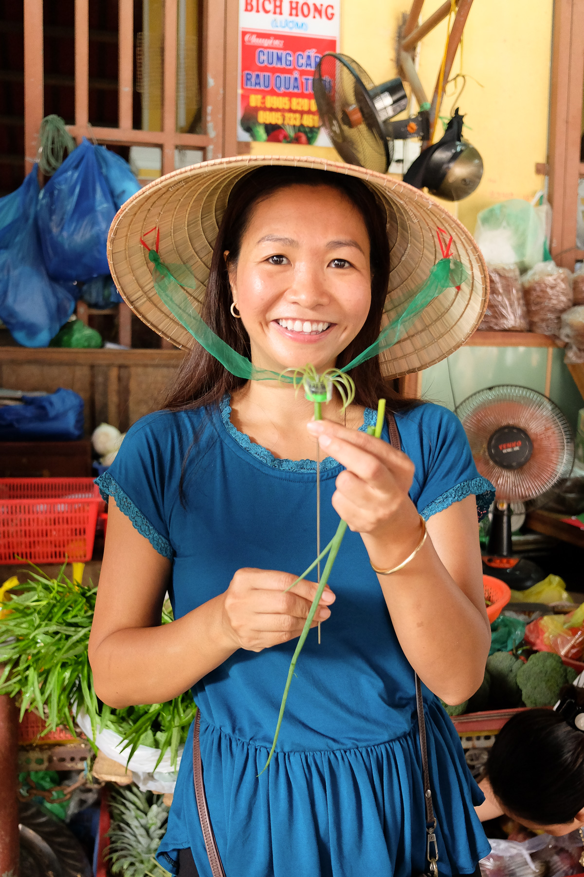 Für unseren dritten Tag in Hoi An hatte ich uns einen Kochkurs bei Green Bamboo gebucht. Wir wurden morgens um 8 Uhr direkt am Hotel abgeholt. Im Minibus saßen neben der Chefköchin Van auch bereits die anderen Teilnehmer: ein jüngeres Paar aus Deutschland, zwei Ehepaare, die in Hong Kong lebten und aus Neuseeland bzw. Australien kamen und ihre vier Kinder. Im Bus wählte jeder aus einer Liste ein Gericht aus, das er an diesem Tag kochen wollte.