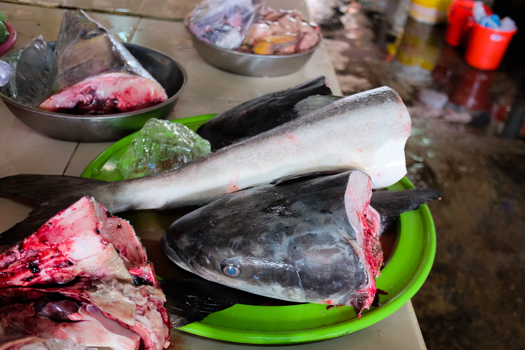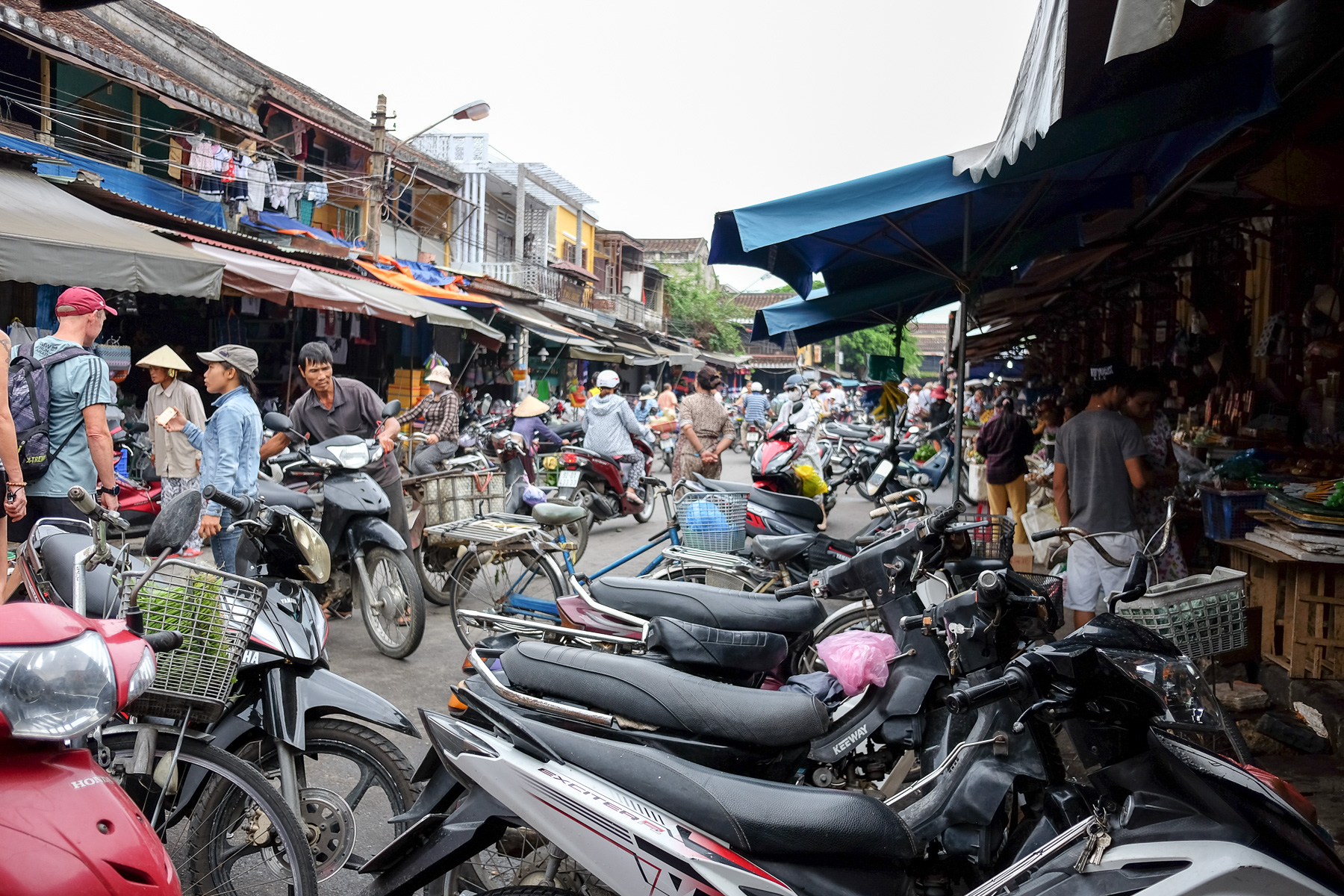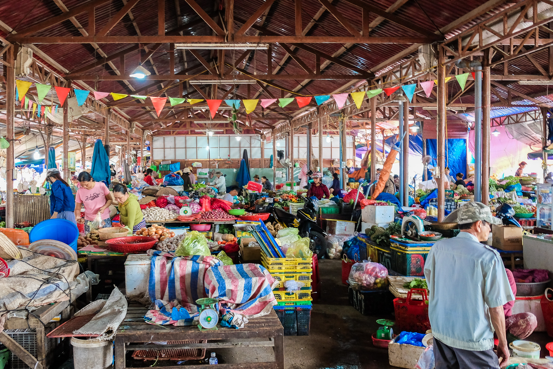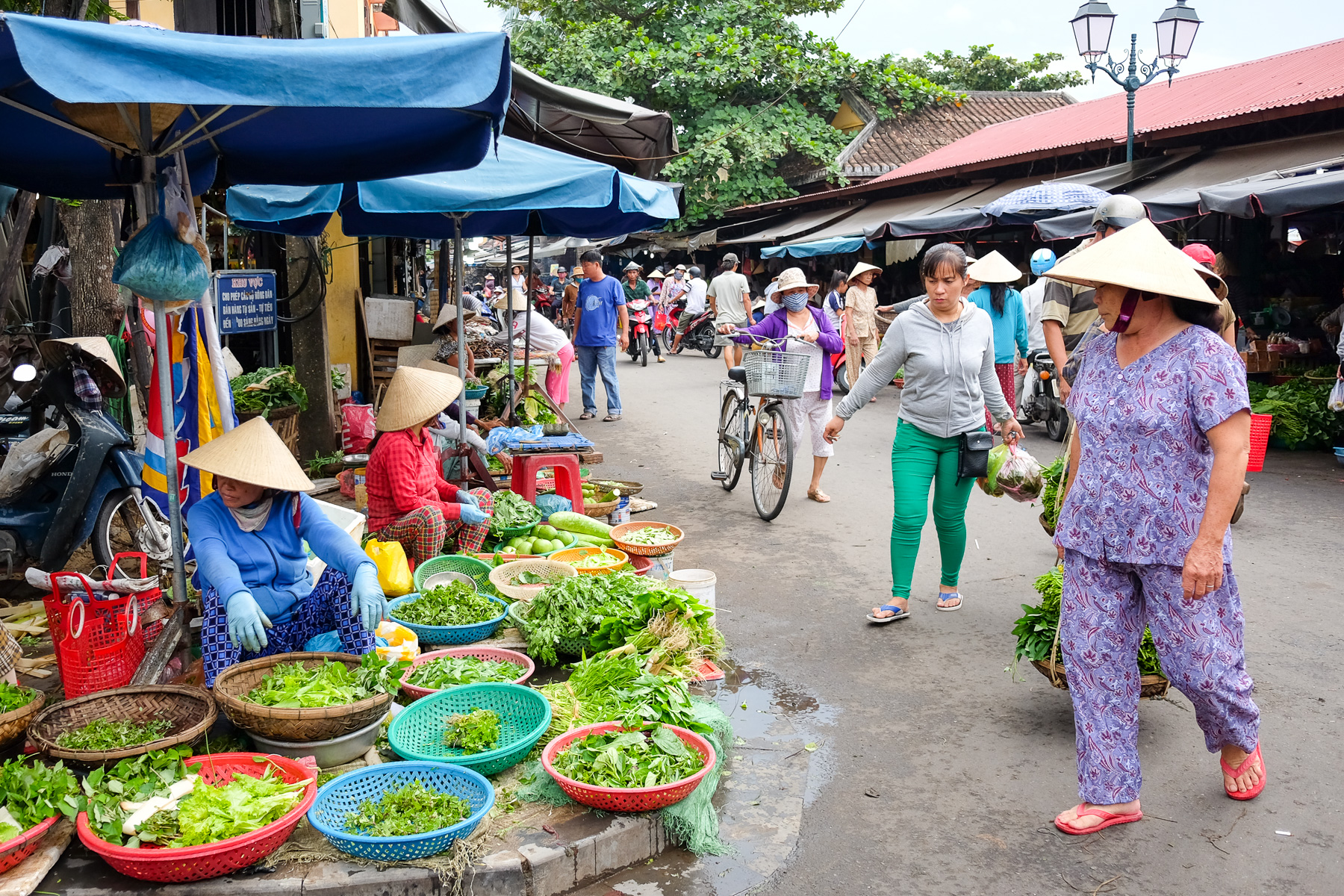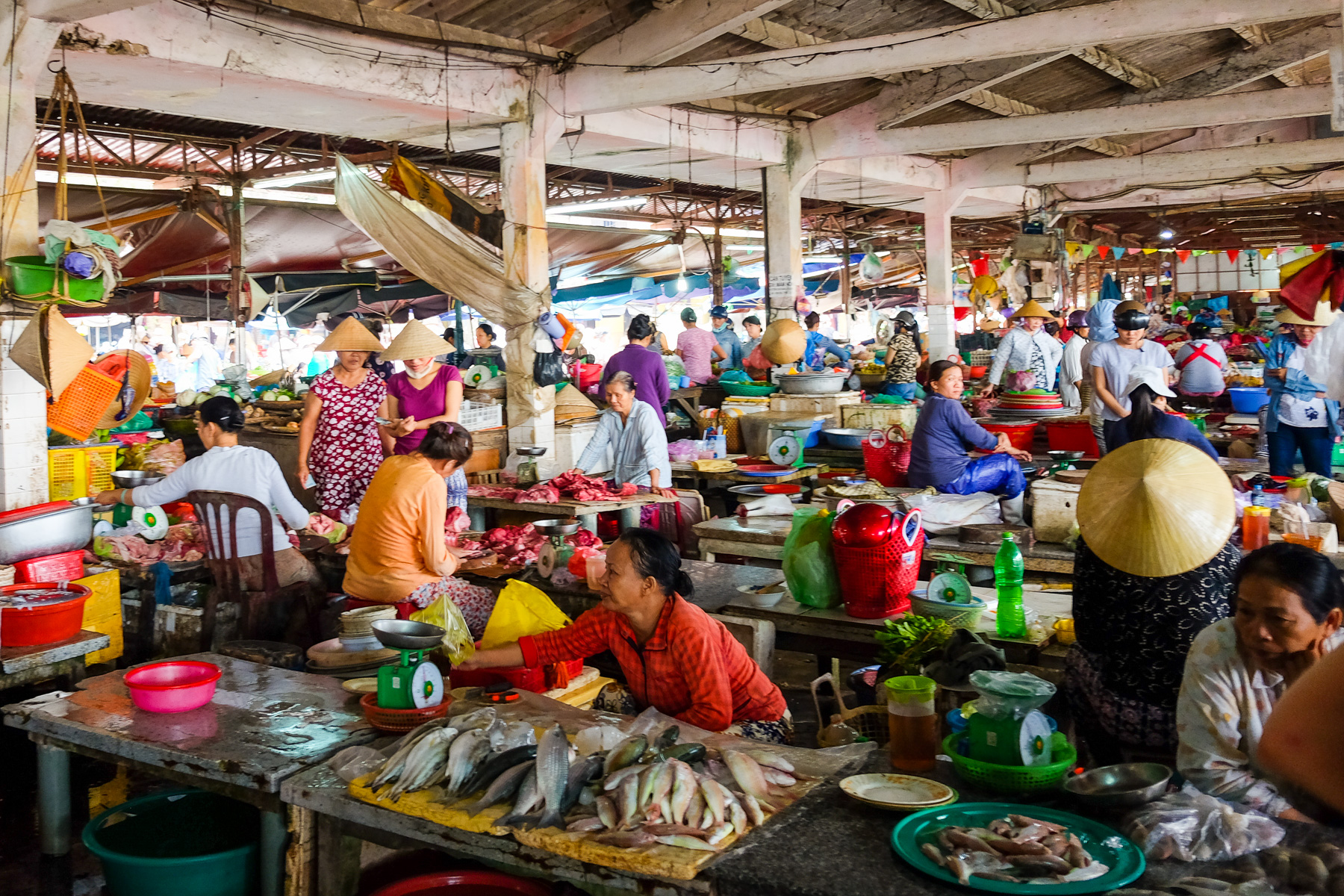 Unser erster Halt war der Markt, wo wir die Zutaten für unsere Rezepte besorgten und uns Van erklärte, wie das Markttreiben in Vietnam funktionierte.