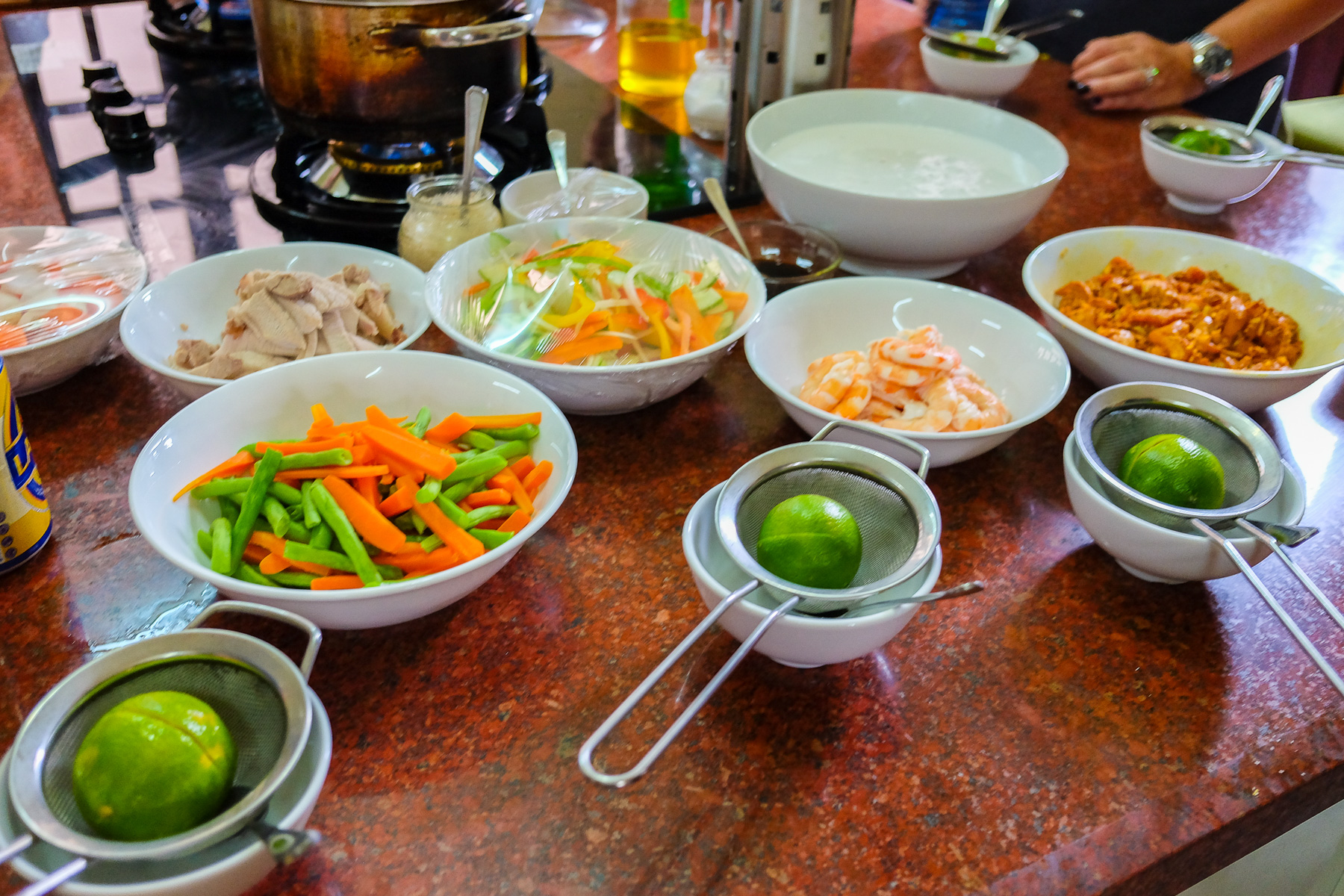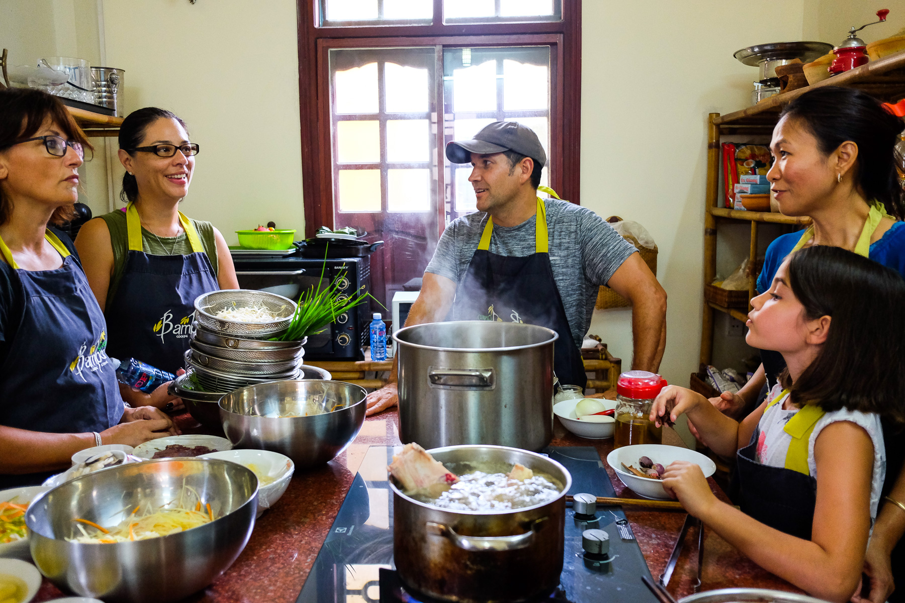 Nachdem wir alles besorgt hatten, machten wir uns auf den Weg in die Kochschule, die gleichzeitig die Wohnung von Van war. Dort warteten bereits 3 weitere Küchenhilfen auf uns, die die Einkäufe entgegen nahmen und die ersten Vorbereitungen trafen. Van reihte uns um einen großen Tisch in der Küche und erklärte, wie unsere Gerichte zubereiten würden. Im Anschluss war jeder mit seinem eigenen Rezept beschäftig, schnippelte und würzte unter Anleitung der Kochchefin. Bis zum Ende des Kurses hatten wir nacheinander diese Speisen zubereitet und geteilt: