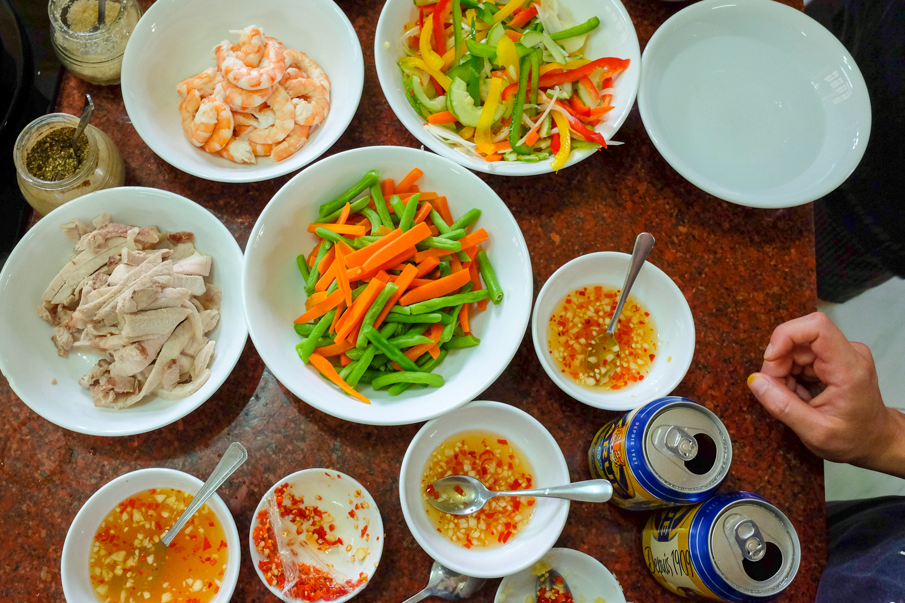 Sobald ein Gericht fertig war, bekam jeder eine kleine Portion zum Probieren. Das summierte sich natürlich und nach den vielen Gängen war jeder pappsatt. Es war sehr interessant einen Einblick in die vietnamesische Küche zu bekommen, v.a. zu lernen wie die einzelnen Geschmäcker (sauer, scharf, süß, salzig) zusammenspielen. Zum Abschluss trank jeder noch einen Macadamia-Schnaps (nom) und wir wurden mit einem Kochbuch und ein paar Küchenutensilien ausgestattet wieder zurück ins Hotel gebracht.
