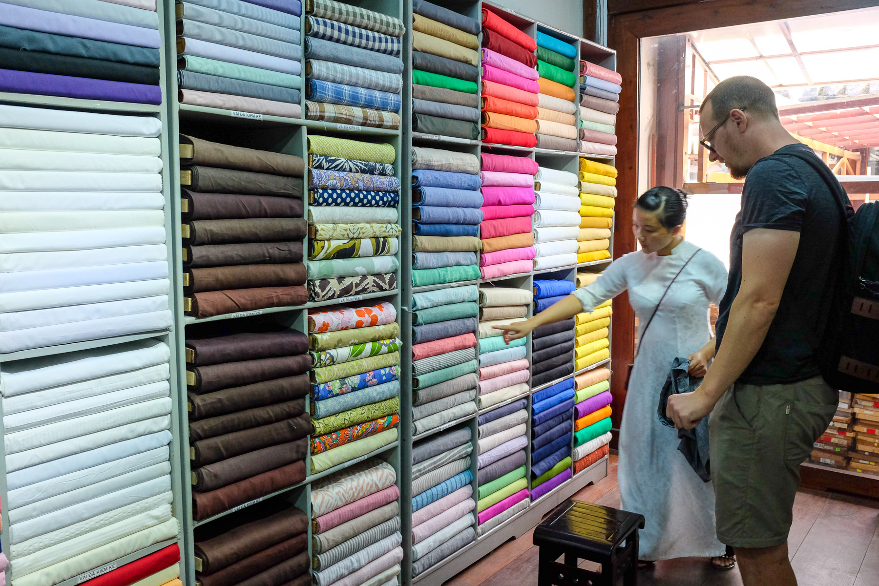 Marc wollte sich seine kurze Hose nachschneidern lassen, da diese schon recht alt war und der Stoff etwas dünn wurde. Wir wählten dafür die Schneiderei Yaly Couture aus, wo er sich zwei Stoffe aussuchte. Dann wurde noch Maß genommen und für 25 Dollar sollten die neuen Hosen schon am nächsten Tag fertig sein.
